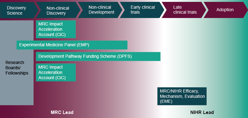 - MRC Developmental Pathway Funding Scheme: The MRC's flagship translational scheme, supporting academically-led projects aiming to develop and test novel and repurposed therapeutics, medical devices, diagnostics and other interventions across all areas of unmet medical need. Repurposing projects can include pre-clinical or clinical studies up to and including phase IIa. Annual budget c.£30 million; three rounds per year.